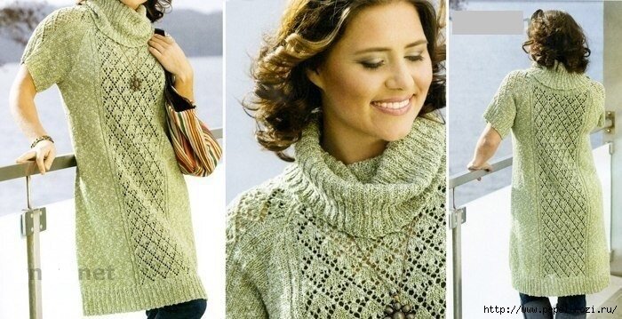 Как порой бывает трудно подобрать обновку, если дама от природы широка в кости, а это платье будет идеально сидеть на любой фигуре. Широкая полоса ажурного узора выполняет сразу несколько функций- благодаря ей платье может слегка растягиваться в нужных местах, выглядит очень элегантно и скрадывает формы. Повседневное платье легко превратить в вечернее, связав его из черной пряжи и заменив широкий воротник узкой бейкой. Размеры: Plus S (М) L (XL) Размеры соответствуют российским размерам от 52 до 60. Ширина изделия по обхвату груди: 101 (111) 121 (131) см Ширина изделия по нижнему краю: 141 (152) 163 (174) см Длина изделия: 90 (92) 94 (98) см Вам потребуется: пряжа (100% шерсти; 50 г/112 м) -16 (17) 18 (19) мотков серозеленой;
