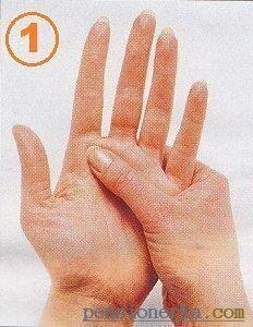 Вы нервничаете, страдаете от простуды или головных болей? Избавиться от неприятных симптомов вам помогут руки. На ладонях наших рук есть особые чувствительные точки, соотносящиеся с разными частями нашего тела. Массируя или стимулируя эти точки, можно помочь организму гораздо эффективнее бороться и быстрее справляться с болезнями. Оказывается, с помощью целительной силы ваших рук, вполне возможно избавиться от головной боли без лекарств , для этого необходимо лишь освоить простые методы. Для моментального избавления от некоторых видов боли вы можете попробовать простые приемы самопомощи: 1. ПРОСТУДА Чтобы облегчить симптомы простуды или сенной лихорадки, найдите «больную точку», которая находится на ладони между основаниями среднего и безымянного пальца. Большим пальцем другой руки в течение двух минут хорошо массируйте эту точку круговыми движениями по и против часовой стрелки. Этот массаж особенно хорошо действует, если из-за синусита у вас болит голова в области глаз и носа. Ч