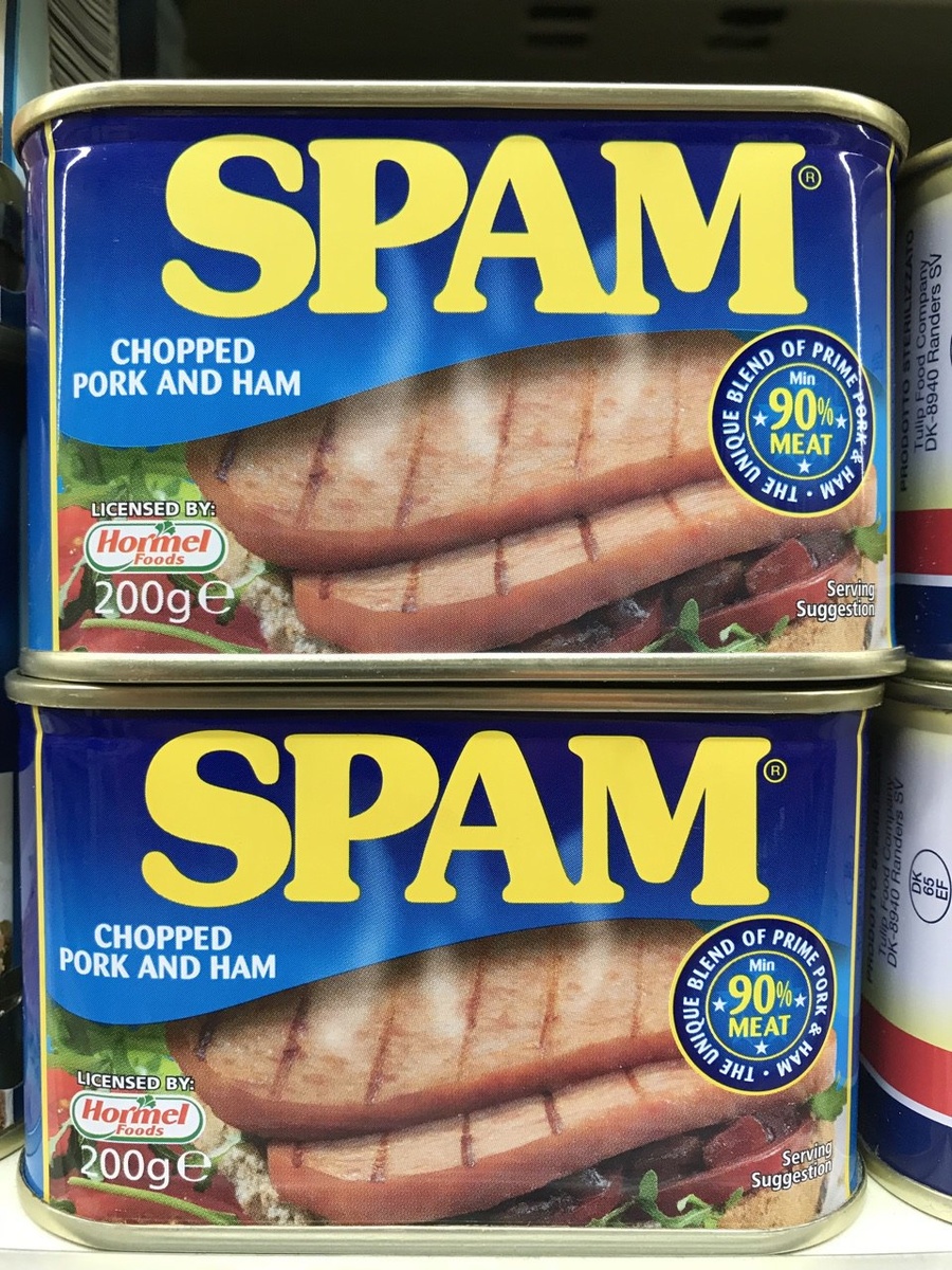 Английское слово Spam произошло от словосочетания spiced ham - "ветчина со специями". Это название родилось в стенах американской компании Hormel, которая запатентовала его как торговую марку. История началась в 30-е годы, когда у компании скопился огромный запас второсортного мяса, и Hormel начала массированную маркетинговую кампанию по сбыту своих залежей. Новоиспеченный спам удалось в чудовищном количестве продать американской армии, которая во время Второй мировой не смогла справиться с ним в одиночку и поспешила поделиться со странами-союзниками. Запасов хватило аж до конца сороковых, в послевоенной Англии спам являлся одним из немногих продуктов питания. В начале 70-х термин "спам" обыграл шоу "Летающий цирк Монти Пайтона". Была такая сценка: в кафе официантка зачитывает посетителям меню, где все блюда приготовлены из спама: спам с яйцом, спам с помидорами, сосиски из спама и так далее. За одним из столов сидят викинги, поющие: "Спам, спам, спам! Вкусный спам! « Когда появился и