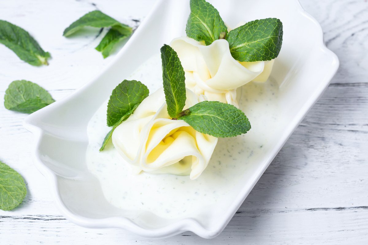 Эта удивительно вкусная, нежная и одновременно пикантная закуска родом из Самегрело. Существует несколько разных рецептов приготовления гебжалия. Вот один из самых простых. Необходимые продукты: Мацони – 100 г Сыр сулугуни – 150 г Мята – 1 пучок Вода – 150 мл Соль по вкусу Способ приготовления: Мяту выложить в блендер, добавить соль и перемешать до образования однородной массы. В кастрюлю влить воду и расплавить в ней сулугуни. Сыр быстро выложить на чистую поверхность и раскатать в лепешку. Смазать лепешку частью мятной массы и свернуть в рулет. Нарезать на небольшие кусочки и выложить в порционную посуду. Вторую половину мятной массы перемешать с мацони, полученной смесью залить сырные рулетики. Украсить листиками мяты. Блюдо готово. Приятного аппетита!