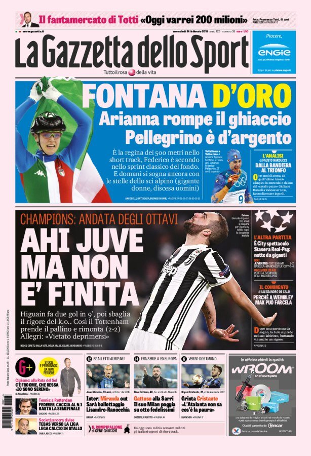 Блог В гостях у Кальчо представляет вашему вниманию обзор первых полос ведущих итальянских спортивных изданий. Ай, «Юве»! Но это не конец. Лига Чемпионов, первый матч 1/8-финала. Игуаин забил два гола за 9 минут, затем ошибся в пенальти, который мог нокаутировать. Так «Тоттенхэм» забрал инициативу и отыгрался (2:2). Аллегри: «Нельзя впадать в депрессию». В другом матче «Сити» устроил представление. Этим вечером «Реал»-«ПСЖ»: ночь гигантов. «Интер»: Миранда вылетел. Будет борьба Лисандро-Раноккья. Гаттузо как Сарри. Его «Милан» опирается на восьмёрку верноподданных. Решительность Кристанте: «Аталанта» не знает, что такое страх». Фантастический рынок Тотти: «Сегодня я стоил бы 200 миллионов». «Юве», слишком много страха стоят Почеттино. За десять минут Игуаин вывел Бьянконери вперёд (2:0), затем поспособствовал первому голу «Тоттенхэма» и не забил пенальти, который мог сделать счёт 3:1. Команда Аллегри не нашла больше смелости отреагировать и пропустила со штрафного абсурдный ничейный