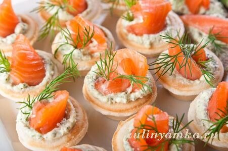 Семгу в этих тарталетках можно заменить малосоленой форелью или другой красной рыбой, а мягкий сливочный сыр — творожным. Вместо малосоленой будет хороша и копченая рыба. Для украшения закуски пригодится зелень и красная икра. Состав: Как приготовить тарталетки с семгой Малосоленую рыбу нарезать тонкими пластиками. Зелень укропа вымыть, обсушить салфеткой и мелко нарезать. Очень удобно делать это ножницами. Мягкий сливочный или творожный сыр смешать с укропом и наполнить им тарталетки. Сверху положить ломтик рыбы и украсить веточкой укропа. Для украшения и дополнительного вкуса тарталеток с семгой можно использовать оливки или маслины.