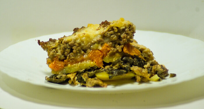 Но внутри у нее много разных слоев. Слой вареной картошки, жареных грибов, опять картошки, отварной курицы, тыквы, говяжьего фарша и... все. Да, забыла - все полито слоем соуса. В нем и запечено. Как ее приготовить? О! Просто. Выкладываешь слоями и через слой слегка поливаешь соусом. Что нужно на семью из четырех человек? 4 вареных картофелины