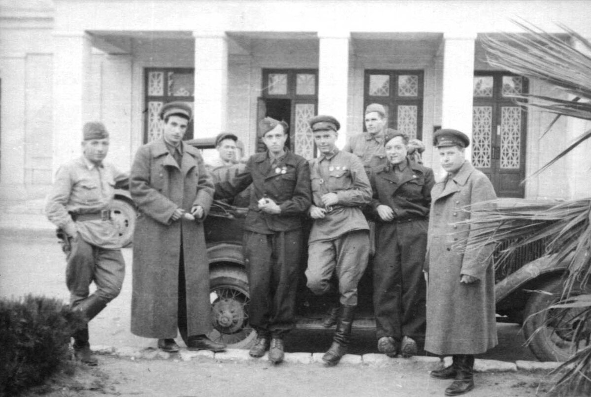 На фото (слева направо) операторы и начальники фронтовых киногрупп: А.Д. Каиров, Р.Г. Григорьев, С.И. Коган, М.А. Трояновский, А.Ф. Казначеев, И.П. Копалин на Закавказском фронте. Туапсе, октябрь, 1942. Группа морских пехотинцев-разведчиков получает боевое задание. Бой за населенный пункт Шаумян северо-восточнее Туапсе, декабрь 1942 г. Горная 76,2 мм. пушка образца 1938 года. 76,2 мм. дивизионная пушка образца 1939 года. 122 мм. дивизионная гаубица М-30 образца 1938 года. 152-мм гаубица-пушка образца 1937 года (МЛ-20). Контратака морской пехоты. Расчет 130 мм. орудия 743-й батареи капитан-лейтенанта Спахова (орудия снятые с крейсера "Коминтерн" для обороны Туапсе) в "минуту затишья". На переднем фоне - петух-любимец личного состава, выросший на батарее и прошедший "с боями" от Туапсе до Керчи в 1942-1944 гг. Все время находился при орудиях и заранее реагировал на вражеский огонь и налеты авиации. За "безупречную службу" моряки присвоили ему звание "старшина I статьи