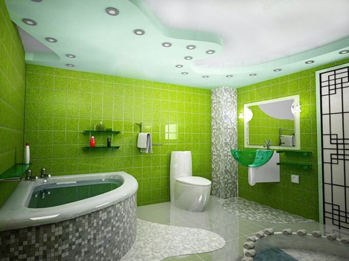 - Потолок должен быть изготовлен из водостойких материалов, в противном случае испарения и брызги воды неизбежно испортят покрытие. Кроме того, водостойкие поверхности смогут лучше перенести внезапно хлынувший поток сверху, если соседи случайно затопят помещение.