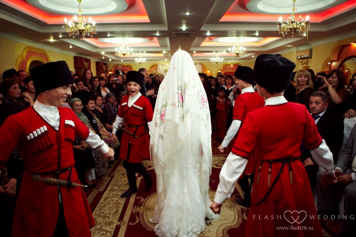 Или вот еще очень красивый обычай: в момент, когда невесту представляют родственникам жениха, ее голову покрывают платками. Звучит зажигательная лезгинка, и ребята (чаще всего это профессиональные танцоры), двигаясь в ритме зажигательной музыки вокруг невесты, снимают один за другим платки, постепенно открывая ее. После того как снимают последний платок и невеста остается в фате, к ней подходят пожилые родственники жениха, приветствуют ее в новом доме, обнимают и говорят пожелания. До этого невесту родители жениха не должны были видеть, так же как и родители невесты не видят до свадьбы жениха».