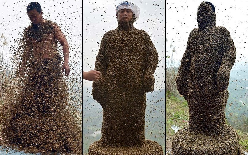 Китайский пчеловод посадил на себя 109 кг пчел и побил рекорд Гиннеса.