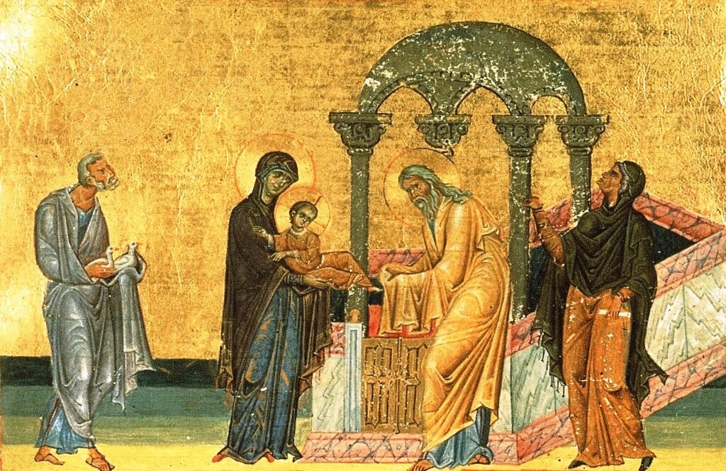 Евангелист Лука рассказывает о двух иудеях, мужчине и женщине, для которых ожидание рождения Спасителя стало целью жизни. Пророчица Анна осталась вдовой, прожив в браке всего лишь семь лет. Она не вышла замуж вторично, не стала искать себе занятия «в миру», но «не отходила от храма». Можно предположить, что она жила при Храме (что было вполне возможно, поскольку рядом с Иерусалимским Храмом было множество помещений для служителей и различных хозяйственных построек).