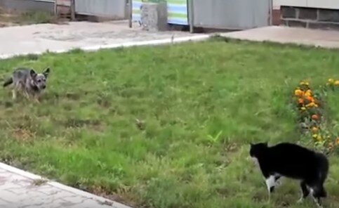 Все вы знаете что собаки не любит котов, а коты не любят собак. В большинстве случаев собаки обижают котов. Котикам приходится убегать от собак. Но бывают моменты, когда совсем наоборот. Как-то парень увидел, как кот начал подкрадывается к собаке. Пес замер и ждал, что же кот будет делать. Конечно все это парень решил снять. Любая-бы собака сразу бросилась на кошку, но этот пёс понял, что-то тут не то. Через некоторое время собака все же бросилась на кота, но это было зря. Буквально через секунду после этого, собака начала убегать, поджав хвост и громко скулить. Это оказался боевой кот. Такое очень редко можно увидеть. Но все же есть среди котов такие экземпляры. Если вы когда-нибудь такое встречали, ставьте палец вверх. Нам очень приятно и это мотивирует нас на новые интересные статьи.