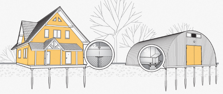 Чисто визуально может показаться, что бетонный фундамент надежнее свайного, одно дело бетонная массивная конструкция, и совсем другое – железные сваи, которые вот-вот упадут или провалятся в грунт целиком.