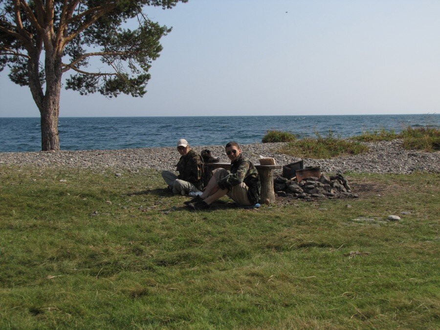 18.08. Запланированный переход в 20-25 километров опять сорвал сильный ветер. Пройдя 10,3 км, мы остановились на каменистом мысу, издалека на нем виднелись столик и скамейки. Зато ветер был настолько пронизывающим, что жаркое солнце будто бы совсем не грело. Недалеко от нас на берегу располагались люди, приехавшие сюда на машине. Они рыбачили. Кстати, здесь нам удалось поймать хариуса на донку (которого ночью кто-то стащил из-под камня...). Пока мы читали, вырезали из дерева и развлекались другими способами, ветер продолжал бушевать. Пытались прятаться от него даже за скамейкой.