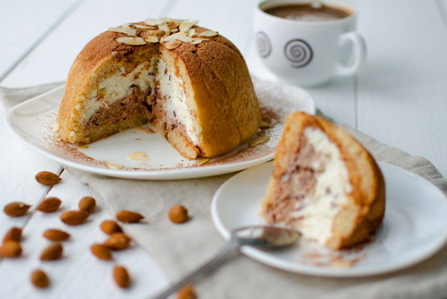 Сегодня на десерт у нас одно из любимейших лакомств жителей Флоренции – Цукотто. Происхождение названия блюда в первую очередь связывают с его тыквообразной формой переводиться с итальянского, как маленькая тыква. Флорентийцы предпочитают версию, согласно которой повар был настолько вдохновлен Собором Санта-Мария-дель-Фьоре, что решил создать десерт в форме его купола. Ингредиенты: Бисквит – 250 г Сливки 30% – 250 г Рикотта – 300 г Сахарная пудра – 150 г Темный шоколад - 60 г Цукаты – 80 г Какао – 30 г Ликер Амаретто Сперва взбейте до густого крема сливки и добавьте к ним, протёртую через сито рикотту. Разделите полученную начинку на две части. В одну (большую) добавьте измельченные шоколад и засахаренные фрукты, а во вторую какао. Обе тщательно перемешайте. Здесь Вы можете позволить своей фантазии разгуляться, добавив орехи, ягоды, апельсиновую цедру, что душа пожелает. Далее возьмите куполообразную форму (желательно 20-22 см в диа