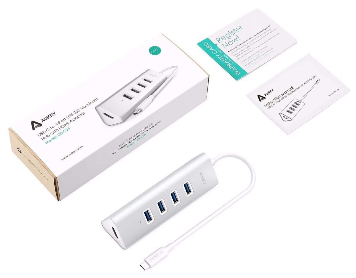 Начнем с улучшения рабочего места. Aukey USB-C Hub (CB-C30) - это мощный компактный USB-C концентратор, который легко превратит один порт USB-C в HDMI и четыре порта USB 3.0 SuperSpeed.