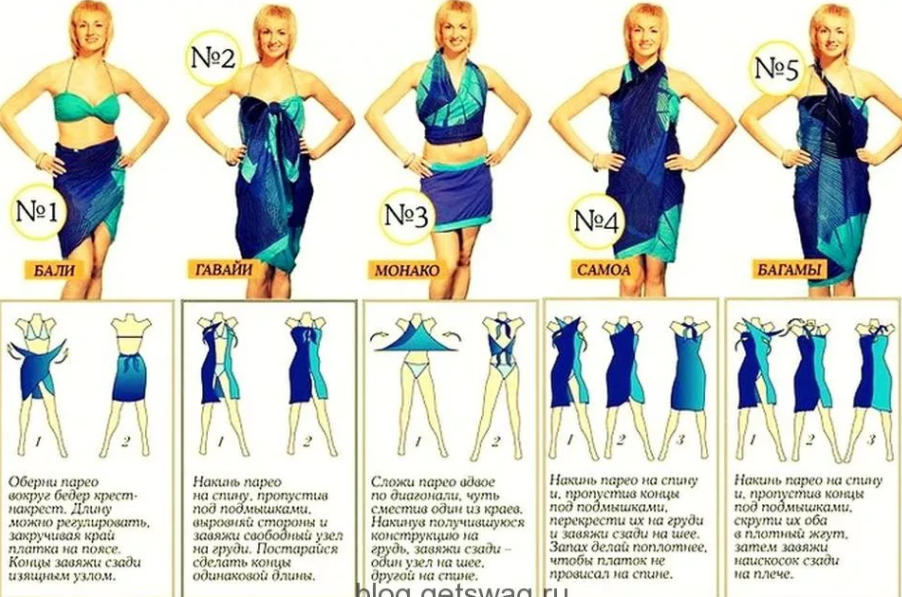 В преддверии лета женщины задумываются не только об обновлении базового гардероба, но и подыскивают пляжную одежду. Выбирая купальник, почти каждая дама стремится подобрать к нему парео – платок больших размеров, сшитый из легкой и невесомой ткани. Полупрозрачность парео дает женщине скрыть недостатки фигуры за тонкой пеленой, выставив напоказ только достоинства и аппетитные формы.На пляже чаще всего можно увидеть, что большой платок повязывают на бедра или тело, а ведь эту стильную вещицу можно носить в массе других вариантов. Парео можно повязывать не только на бедрах, но и просто накидывать на плечи, носить на талии и так далее. Некоторые женщины, купив красивый платок из легкой ткани, долго крутятся перед зеркалом и никак не могут придумать как же его носить, в итоге обновка занимает место в шкафу среди других ненужных вещей. Чтобы такого не произошло, рассмотрим несколько самых популярных способов повязывать парео.1. Платок складывается вдвое по ширине, при этом длину можно рег