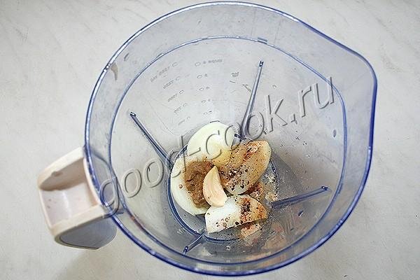 Во-первых, курица маринуется в ядрёной смеси, после чего она становится мягкой и очень ароматной.