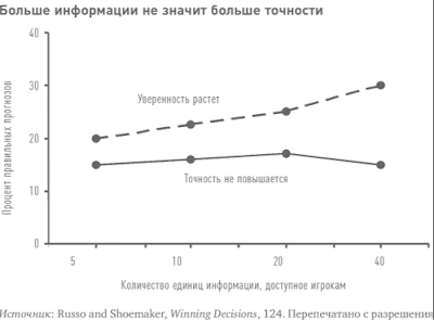 Руссо и Шумейкер отмечают расхожее заблуждение, будто большее количество информации позволяет нам точнее спрогнозировать будущее и улучшить принятие решений. Но на деле дополнительная информация зачастую только усложняет процесс принятия решений.
