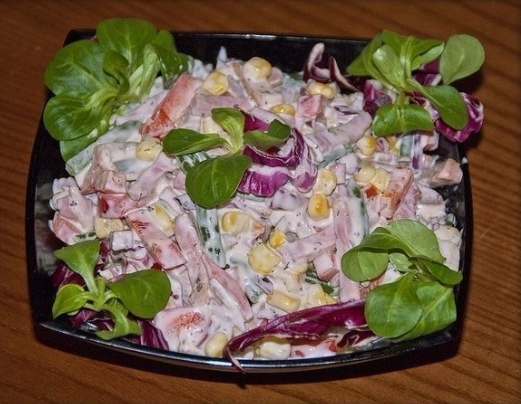 Сочетание ингредиентов удивительно гармоничное. Приготовление весьма быстрое. Не салат, а просто находка! Ингредиенты 400 гр. стручковой фасоли 300 гр. ветчины 300 гр. консервированной кукурузы 1 красная луковица 1 красный сладкий перец Салатные листья зелень Соль и черный молотый перец по вкусу 20 мл соевого соуса 20 мл бальзамического уксуса Майонез Приготовление Луковицу нарезаем полукольцами и кладем в смесь соевого соуса и бальзамического уксуса на 10 минут, а пока опустим фасоль в кипяток на 3-4 минуты и отварим. В миску выкладываем кукурузу, нарезанную соломкой ветчину, нарезанный лапшой перец, фасоль, рубленую зелень и маринованный лук. Добавим соль, черный молотый перец и майонез. Перемешаем. На блюдо выкладываем салат, украшаем салатными листьями и подаем к столу. Приятного аппетита!