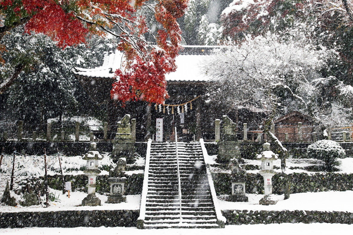 Примерно в семь утра меня что-то разбудило. Я почувствовала какое-то внутреннее ощущение, что спать дольше нельзя. И что снаружи происходит что-то необычное, и в этом непременно нужно поучаствовать. Я раздвинула сёдзи на окнах и не поверила своим глазам, — всё было покрыто толстым слоем пушистого белого снега. Крыши соседних домов, машины, припаркованные напротив, деревья с созревшими плодами хурмы в маленьком садике дома моей соседки Танака. И снег продолжал падать большими белыми хлопьями. Стоял конец ноября, и сезон любования красными кленами еще не был окончен. Поэтому, мне было интересно взглянуть на момидзи в снегу. Я взяла фотоаппарат и отправилась на гору Такао, рядом с которой живу. Круглый год местные жители и туристы поднимаются на Такао, чтобы полюбоваться видом на метрополию и, если повезёт, в солнечный день — на священную гору Фудзи. Но желающих приехать на Такао-сан в тот день оказалось немного. Я бродила практически одна, увязая в сугробах, среди высоченных криптомери