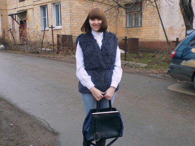 А теперь немного фото. Пока на улице холодновато для жилетки, но через пару недель в ней будет очень комфортно. На собственном опыте скажу, что жилетка из искусственного меха одинаково хорошо смотрится как с джинсами, так и с юбками. Дополните образ удобными сапожками - и вы готовы покорять мир! :)