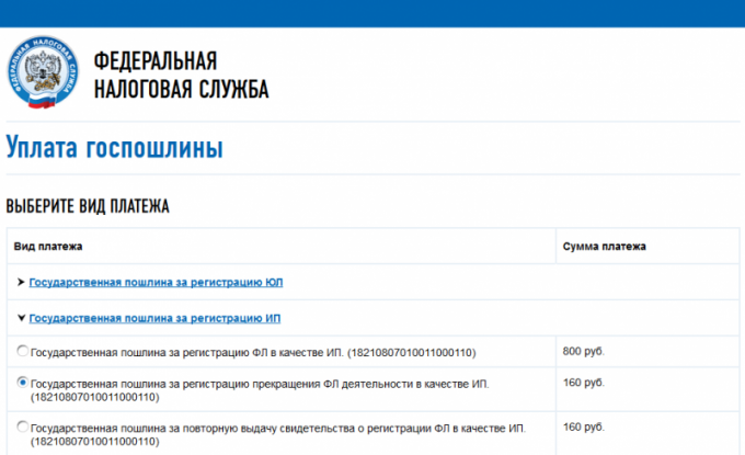 Заплатить госпошлину за закрытие ИП можно безналом и наличным расчетом. Главное точно знать реквизиты налоговой службы, ведь у каждого региона они свои. Реквизиты можно уточнить на сайте Федеральной налоговой службы или обратиться в налоговую службу по месту регистрации. Данные вносятся в форму документа, по которому будет происходить оплата. Госпошлина за прекращение деятельности в качестве индивидуального предпринимателя оплачивается один раз. Ее размер составляет 160 рублей (одна треть от госпошлины за открытие бизнеса в качестве ИП). Для оплаты понадобиться заполнить документ (квитанцию и извещение) и выбрать способ оплаты: безнал или наличный расчет. Если вы знаете реквизиты собственной налоговой службы, то заполнить форму можно самостоятельно через сайт ФНС. Если же с реквизитами возникают сложности, то лучше обратиться к сотруднику банка, который поможет сформировать документ. Формирование документа и оплата через ФНС Документ на оплату (квитанция и извещение) можно сформирова