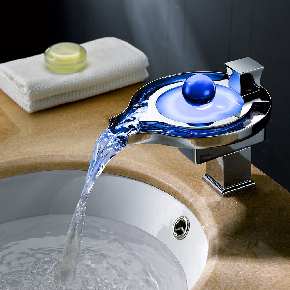Очень оригинальное и изящное решение. Есть три вида подсветки, цвет которой зависит от температуры воды. Синяя до 25 градусов, зелёная до 40 градусов, красная выше 40 градусов. Цена 4000р.