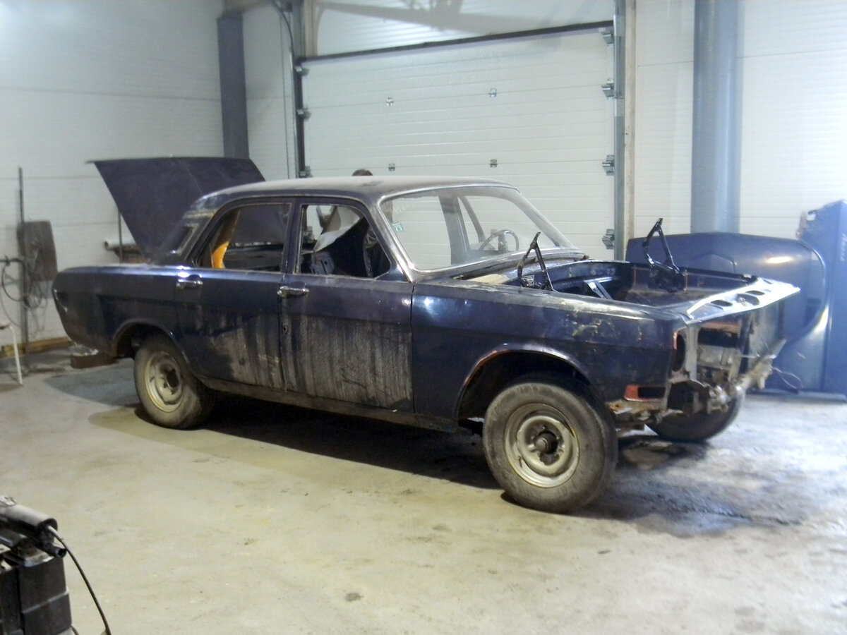 Продолжаем заниматься ГАЗ-24 1971 года выпуска. Это ранняя машина первой серии. В видео, выложенных ранее мы постарались показать ее отличия от более поздних машин на примере именно этой машины. Работы с ней предстоит много, так как возраст у нее почтенный, ее активно эксплуатировали, все это наложило на нее свой отпечаток. Автомобиль полностью разбирается и будет отпескоструен. На нижеприведенных фото он в процессе разборки Двигателя уже нет, под капотом снято абсолютно все. Двери, стекла и крышка багажника еще не сняты. Полностью разобран салон, проводка еще не демонтирована. Передний фартук в работе. Площадка номерного знака была деформирована, под ней был небольшой очаг коррозии, поэтому она была отсверлена, после чего отрихтована, коррозия удалена, все прокрашено кислотным грунтом, после чего пложадка была возвращена на прежнее место. Много времени заняло восстановление геометрии окна под заводную рукоятку. За время эксплуатации окно рукояткой было развальцовано практически в к