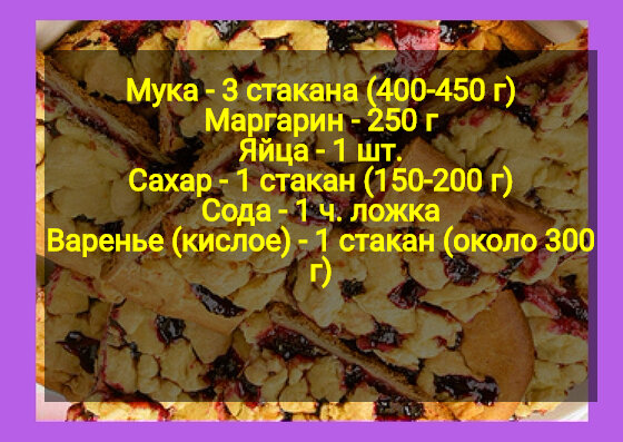 Здравствуйте, хочу Вас познакомить с очень вкусным и быстрым рецептом пирога. Когда гости звонят и говорят что скоро придут, а к чаю ни чего нет. Тогда данный пирог будет для Вас хорошим спасение в такой ситуации! У нас вместо сахара с Вами будет варенье, которое вы предпочитаете не имеет значения. Ингредиенты: Способ приготовления: 1. В глубокую миску сеем муку. 2. Холодные, но не замороженный маргарин натереть на турке. 3. Все хорошенько перемешать до рассыпчатого состояния. 4. Добавим соды и перемешаем, и добавим взбитое яйцо с сахаром. 5. Замесили тесто и поделили его на кусочки, и убрали в морозилку на 5 минут 6. Разогреть духовку и достать 2-3 кусочка и натереть из на дно противеня для духовки. 7. На верх выложим варенье, и засыплем остальными кусочками потертыми на терке. Ставим в духовку разогретую до 190*С на минут 15-20. Все готово! Приятного аппетита!!! Угощайте друзей, Родных и Близких!! Подписывайтесь, Не забываем ставить класс))) Заходите к