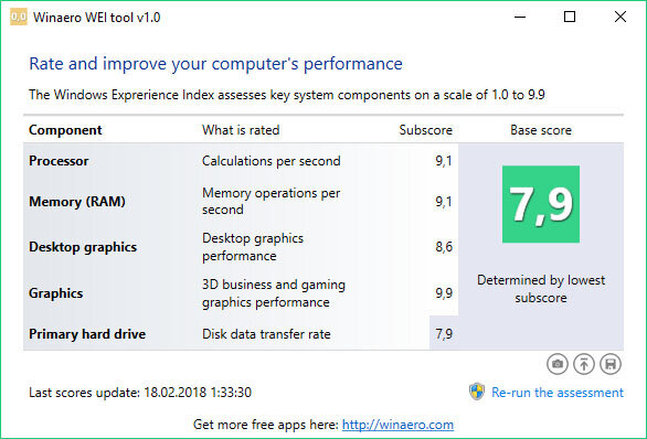 В Windows 7 есть утилита по оценки производительности системы. Она слабенькая и для профессиональных тестов она не подходила и имело максимальную оценку по каждому из пяти критериев в 7,9 балла. В Windows 8 утилита получила небольшое обновление в виде максимальной оценки поднятой до 9,9 баллов, но самое удивительное произошло в Windows 8.1, в которой данная утилита пропала из интерфейса. Хотя оценку все равно можно было произвести с помощью Командной строки, либо PowerShell, но там нужно прописывать кому-то не понятные команды, поэтому для ленивых есть проверенная утилита под названием WEI Tool от WinAero. Для запуска теста достаточно нажать кнопку "Re-run the assessment". Ссылка на утилиту: https://winaero.com/download.php?view.79 Спасибо за внимание, ставьте Лайки и подписывайтесь на канал.