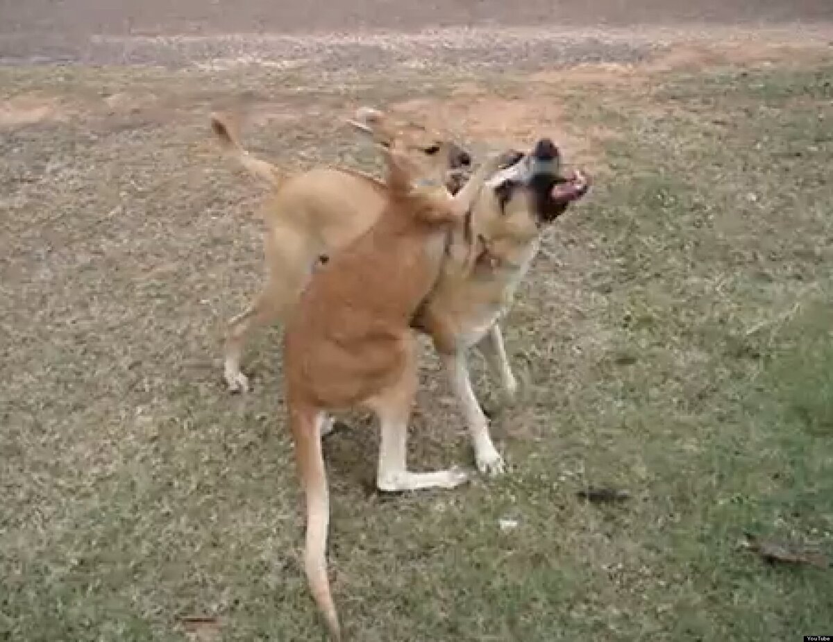 После того, как европейские поселенцы колонизировали Австралию, кенгуру так удачно вписались в новые условия жизни,что им сейчас не грозит исчезновение(в отличие от других сумчатых). Наоборот,после появления белых людей количество кенгуру значительно увеличилось. Сейчас это привело к тому,что их численность приходится регулировать, иначе они заполонят всё вокруг. Поэтому охота на этих зверей в Австралии разрешена. Кенгуру так много,что переодически происходят стычки между ними и домашними собаками. Нужно отметить ,что рыжий кенгуру достаточно силён,чтобы убить пса. С другой стороны обученные охотничьи собаки вполне в состоянии справиться с такой добычей( особенно если охотятся группой). Но беда в том,что с собаками на кенгуру охотятся далеко не все,и порой домашнего любимца приходится спасать Но даже против охотничьих собак у кенгуру есть своя хитрая тактика,Что удивительно, ведь интеллект собаки гораздо сильнее развит,чем кенгуриный. По-крайней мере, так говорят биологи. Но по