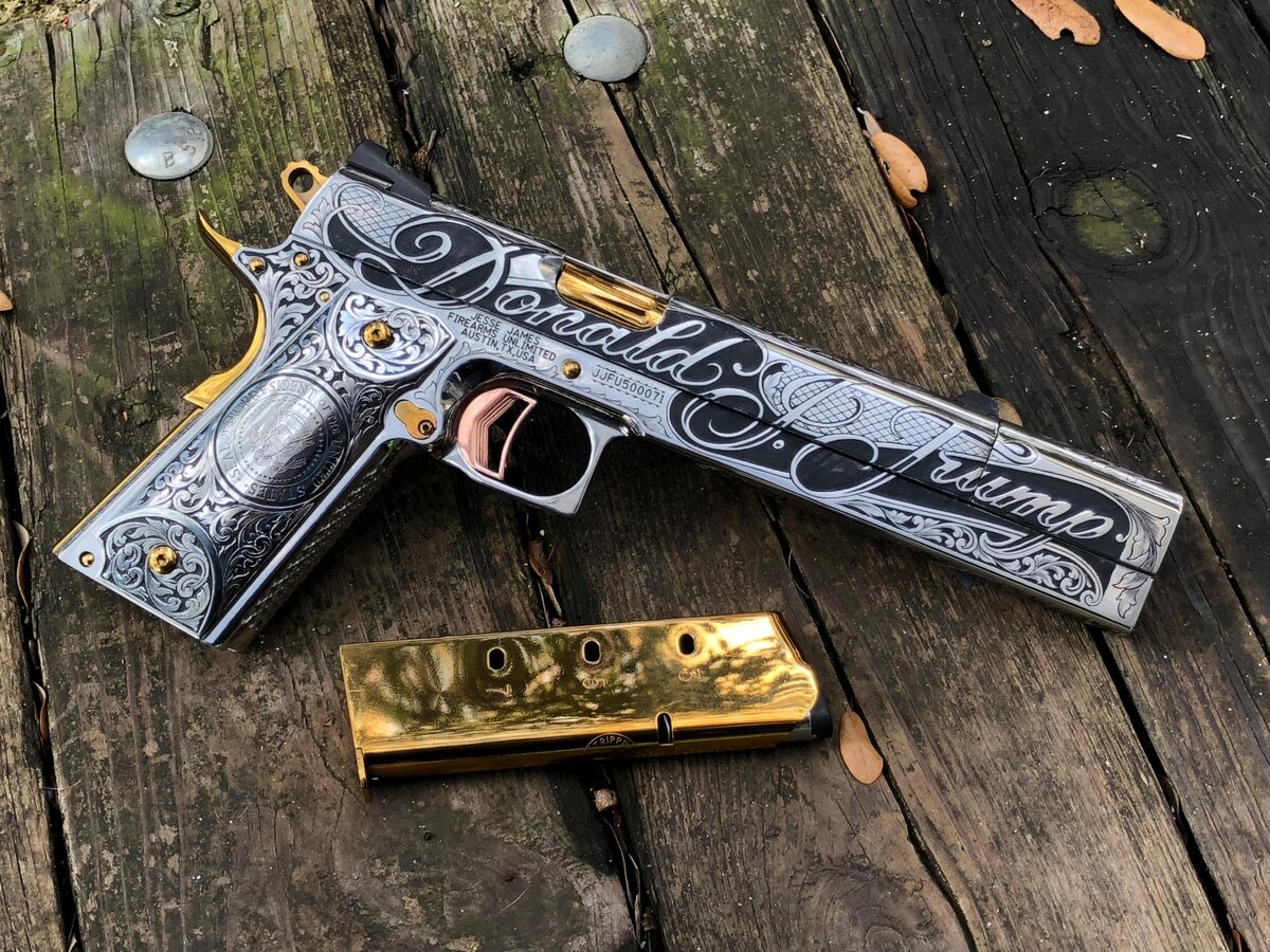 Зрителям канала Discovery Джесси Джеймс известен как бывший владелец мастерских West Coast Choppers и Austin Speed Shop. На «Дискавери» Джесси появлялся в таких реалити-шоу как: Motorcycle Mania, Monster Garage, History of the Chopper, Street Customs и спецвыпусках «Biker Build-Off» шоу American Chopper. В 2013 году Джесси Джеймс прошел курс обучения ремеслу оружейника и открыл компанию Jesse James Firearms Limited, специализирующуюся на производстве уникального оружия. После победы Трампа на выборах 2016 года, Джесси, ранее пересекавшийся с Дональдом на съемках реалити-шоу «Кандидат», решил подарить ему пистолет. Большой, красивый и крутой. «Если у «Грязного Гарри» был угрожающий 44 Magnum, почему бы не сделать пистолет 45-го калибра для 45-го президента США?» – решил Джесси и начал работу над кастомом на основе модели JJFU Grand Master X, в основе которой лежит Colt 1911, но с удлиненной рамкой и установленным компенсатором. Калибр - 45ACP. На пистолет нанесены гравировки «Don