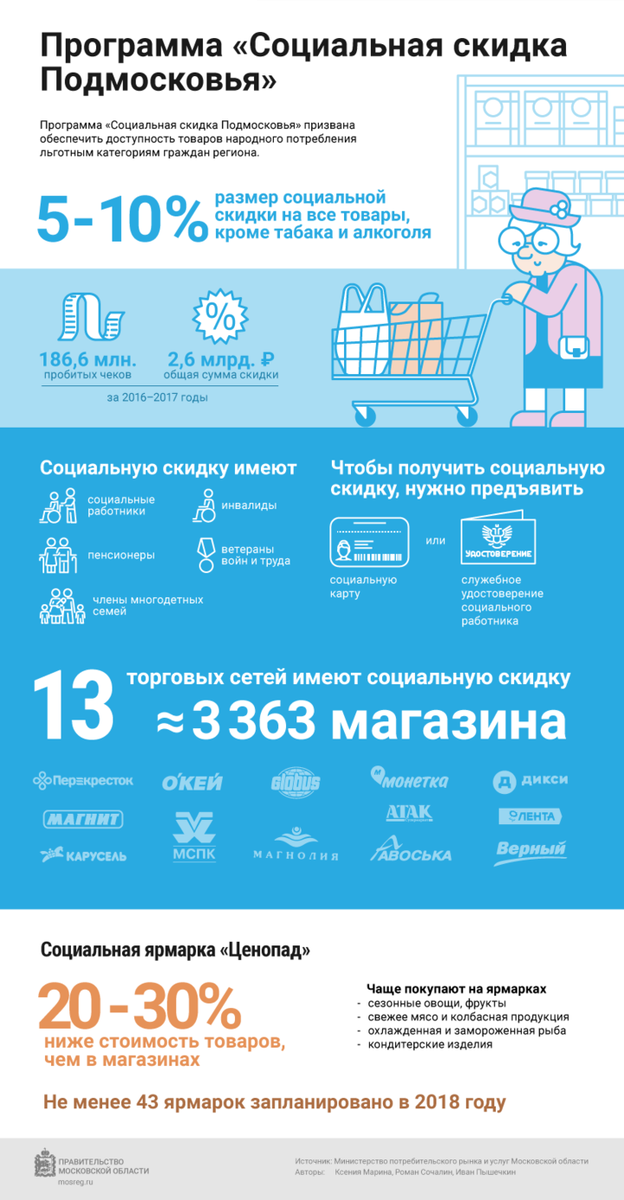 Привет! Недавно открылась новая социальная программа с денежными выплатами! Если ты хочешь получить бесплатный денежный бонус, читай статью у меня на канале или перейди по ссылке в конце этой статьи! Программа «Социальная скидка Подмосковья» действует в регионе уже несколько лет. Ее цель – обеспечить доступность товаров народного потребления льготным категориям граждан. Такая скидка предоставляется в более чем трех тысячах магазинах Московской области. Кроме того, выгодно купить продукты можно на региональных ярмарках «Ценопад», организуемых в разных муниципалитетах. На какие товары распространяются скидки и какие категории граждан могут покупать товары на льготных условиях, смотрите в инфографике! Что бы участвовать в социальной программе нажми на ссылку ниже!