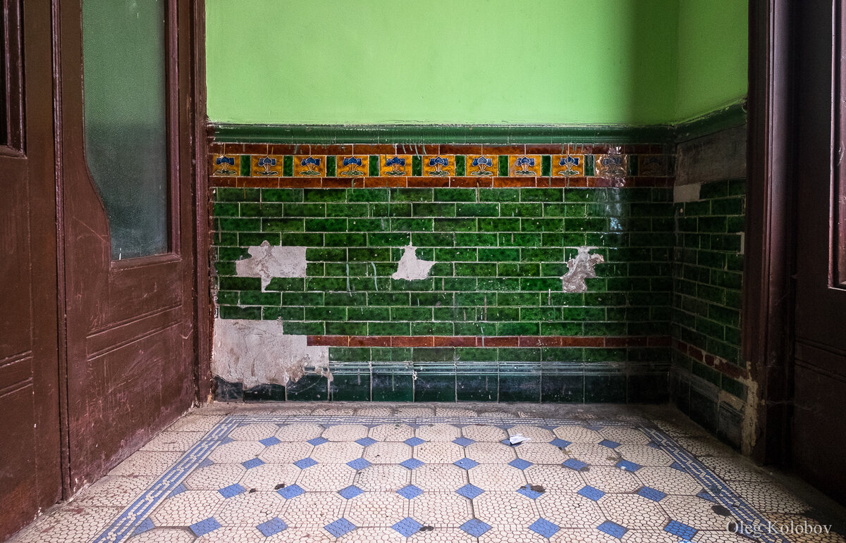 Выдался у меня свободный денёк, я взял фотоаппарат и поехал в центр города поснимать интересные парадные. Но они все оказались закрытыми, никто из них не выходил и не входил, я уже несколько продрог и желание пообедать стало сильнее желания попасть в парадную, как в конце 7-ой Советской улице открылась дверь парадной, из неё вышел мужчина в возрасте, я сделал шаг вперёд и придержал дверь. Он несколько недовольно посмотрел на меня, и в его взгляде я прочитал вопрос: "Не собираетесь же Вы войти в наш, бывший доходный дом Брухи Хаим Мордковны Яполутер, постройки 1909 года в стиле модерн, зайти?" Я также взглядом ответил ему, что да, собираюсь. Сказано - сделано. Вошёл. Рассмотреть дом снаружи я не успел, и моё знакомство с ним началось с очень красивой настенной плитки. Полагаю, что вся метлахская плитка в этом доме изготовлена на предприятии «Линднер», о чём говорит именная плитка около второй входной двери. Иду дальше. Выступ справа когда то