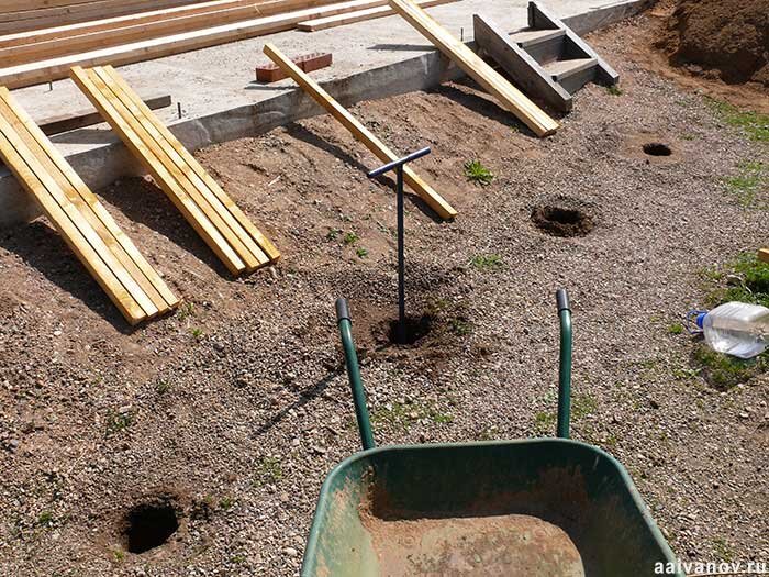 Сначала на месте будущего крыльца размечаются места будущих шурфов. Оптимально их размещать через полтора метра. Шурфы забуриваются ручным буром на глубину 90-100 см. Оптимальный диаметр 20 см. Затем берется канализационная труба того же диаметра и режется на куски по 25-30 см. Эти отрезки вставляются в шурфы так, чтобы над поверхностью земли они выступали примерно на 10 сантиметров. Они не позволят бетону растечься в разные стороны, и придает конструкции опрятный вид. Верх конструкции выравнивается по уровню. В нижней части шурфов садовой тяпкой на длинной ручке делается грушевидное расширение, чтобы эта шишка препятствовала зимой выдавливанию бетонного столба вверх: И в этот же день конструкция заливается бетоном. Стержни арматуры выступают на 8-9 сантиметров. Я прикрыл конструкцию лавками. Нужно дать бетону схватиться и его не следует беспокоить дня -3-4. Через несколько дней делается следующий этап работ. Делается опалубка, под нее подсыпается песок. Укладывается горизонтальная ар