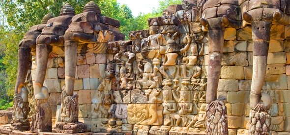 Самым ранним государством на территории Камбоджи считается государство Фунань, возникшее в начале первого тысячелетия нашей эры. С той поры повсюду возводились прекрасные дворцы и храмы. Сегодня совсем немного о так называемой слоновьей стене или террасе, которая является частью древнего города храмов Ангкора. Это высокая стена длиной несколько сотен метров. Построена она была в XIII веке, и является подлинным произведением кхмерского искусства. Стена получила название из-за множества слонов вырезанных из камня, причём где-то слоновый рельеф лишь немного выдаётся вперёд, а где-то резьба выполнена глубоко. В некоторых местах сооружены колонны в виде хоботов. Но не только слоны украшют стену Напротив террасы находилась Королевская площадь. Потому во время важных событий здесь собирались горожане. На площади также проводились ярмарки, праздничные гуляния. И, конечно, такая архитектура способствовала созданию особого настроения. В стене имеются арки, лестницы и, даже, был потайной