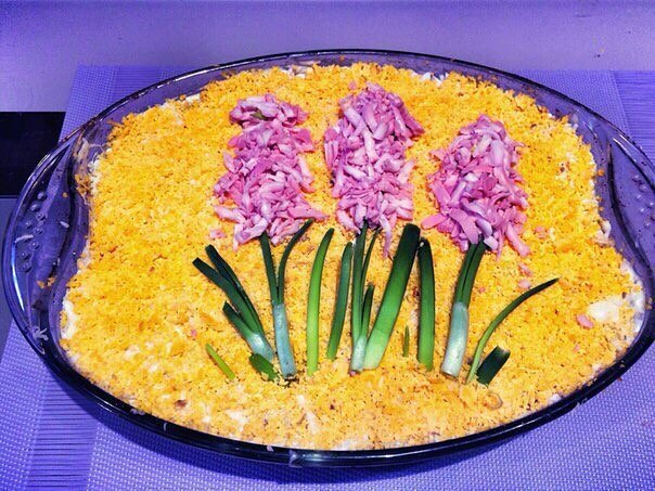Перед подачей настол оформить салат перьями зеленого лука и окрашенными яичными белками (разделить на 3 части, окрасить свекольным, соком. Охладить .