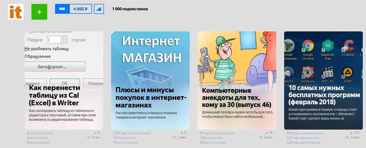 Сегодня утром на моем канале itblog21 был достигнут рекорд по числу подписчиков. Их теперь больше тысячи. И раз уж началась такая петрушка, я поделюсь и другой статистикой. Возможно, она вам поможет. Свой Дзен-канал я создал 5 декабря 2017 года. Через 12 дней у меня было уже 100 подписчиков. Тогда же были заработаны первые 1 000 рублей. Основной контент на канале — это перепосты с личного IT-блога (itblog21.ru), а также совершенно новые публикации на тему компьютеров, мобильных гаджетов, интернета. Большая часть постов — это советы. В общем в канале я публикую все то, в чем более-менее разбираюсь (на IT-тематику я пишу уже почти полтора десятка лет). За все время (2,5 месяца с момента создания) Дзен-канал посетило 221 тыс. посетителей. Число просмотров — 460,5 тыс.