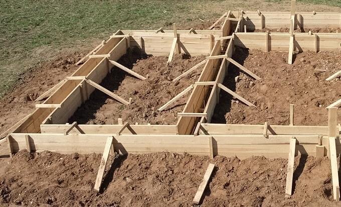 Опалубку при самостоятельной заливке ленточных фундаментов частных домов обычно монтируют из обрезной доски толщиной в 2-2.5 мм. Сначала из такого материала собирают щиты по 2-3 доски. Далее щиты устанавливают по краям выкопанной траншеи и укрепляют подкосами и перемычками.