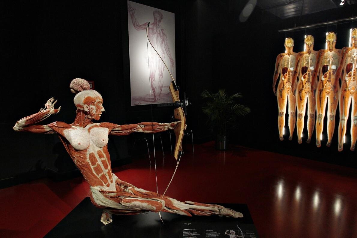 В институте платинации Гюнтера фон Хагенса показаны сохранившиеся тела в творческих позициях - как этот лучник - для демонстрации тонкостей человеческой формы.