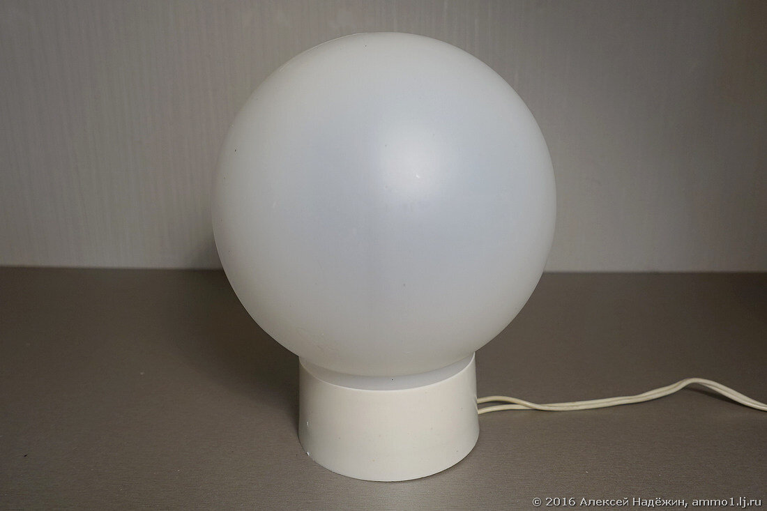 Нам понадобится светильник с шарообразным матовым пластиковым колпаком. Этот матовый колпак и будет усреднять яркость излучения лампы в разных направлениях. Такой светильник можно купить за 87 рублей в магазинах Леруа Мерлен. На картинке там другой светильник со стеклянным плафоном - не обращайте внимание: в самих магазинах то, что надо.