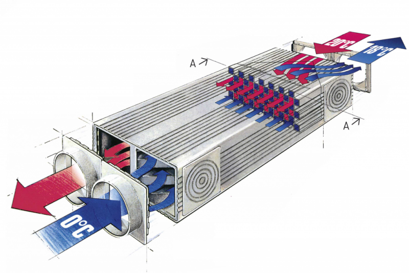 Теплообменник — это устройство, производящее непосредственную передачу тепловой энергии. Они бывают разных типов, с передачей тепла от одинаковых или разных видов среды (например, вода-воздух). Рассматриваемые нами теплообменники производят обмен энергией между исходящим нагретым и приточным холодным воздухом.