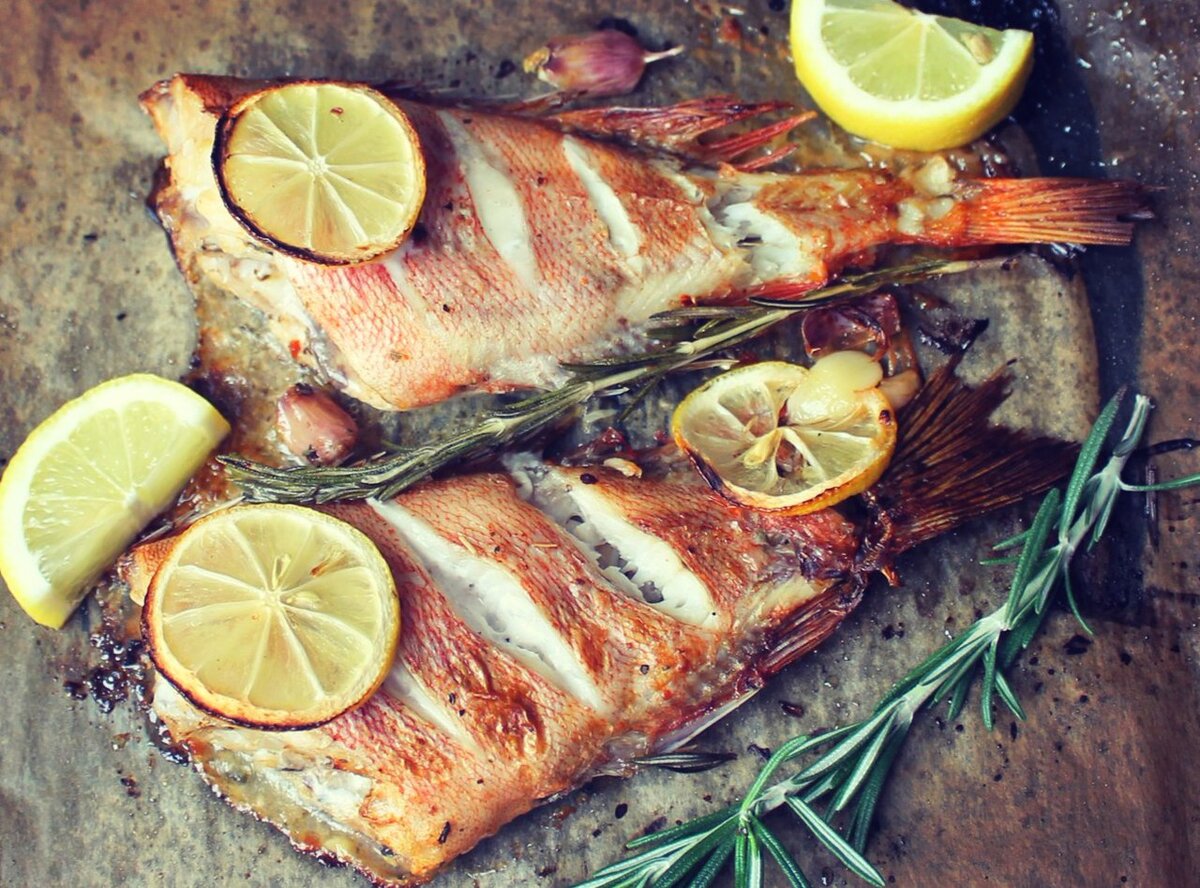 Выложим рыбу на противень, застеленный пергаментом, добавим пару веточек розмарина и дольки лимона. для чудесного аромата.