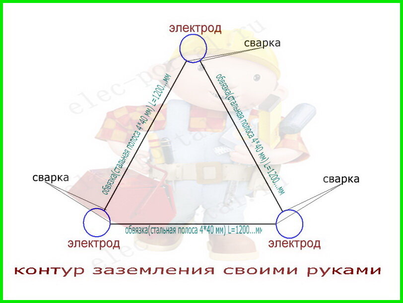 Недавно ремонтировал электропроводку у моих друзей в саду и столкнулся с насущным: моим друзьям потребовалось заземление для электрического котла отопления, но на участке где расположен их садовый домик заземления нет. Изрядно поискав в интернете специалистов и узнав цены мои знакомые приуныли.Но на то она и поддержка друзей-я подсказал им что и как нужно сделать, что бы своими руками выполнить вот этот пресловутый контур заземления. С хозяином мы закупили в строительном магазине стальную полосу толщиной 4 мм и шириной 40 мм, взяли 3 оцинкованных трубы диаметром 100 мм длиной примерно 1,2м (что осталось от постройки навеса для автомобиля) приварили к ним согласно чертежа стальную полосу и подготовили к установке когда оттает земля. Отверстия под трубы(электроды) мы пробурим по весне и траншею под полосу так же выкопаем весной.Можно конечно и зимой но,сами понимаете это ...как то не климатит ). После того как приварим к контуру отходящую полосу для подвода ее к дому и послед