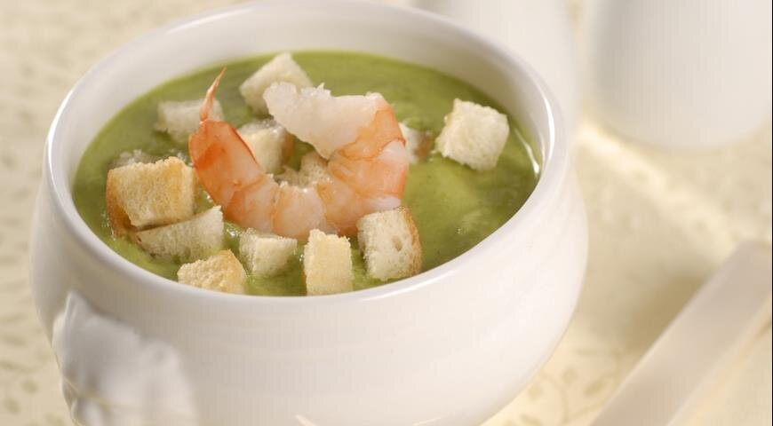 Готовый суп-пюре разлить по тарелкам, положить по соцветию брокколи, креветки и горстку обжаренных кубиков хлеба с чесноком.