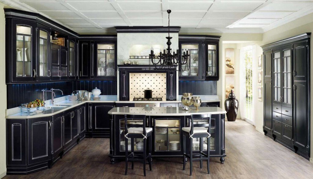 Темная кухня, безусловно, является одним из самых практичных интерьерных решений, поскольку ее принято считать немаркой. Кроме того, темная кухня выглядит обычно просто, но при этом основательно и надежно. Однако испортить этот эффект можно, неправильно выбрав столешницу. Выбор столешницы для темной кухни во многом обусловлен спецификой общего интерьера. Обычно дизайнеры предпочитают подбирать под темные кухни столешницы контрастного оттенка, поскольку обычно столешница является разграничителем верхнего и нижнего яруса гарнитура. И при выборе светлой столешницы эта граница становится четкой. Данный прием можно применить и на своей кухне, но делать это необходимо с осторожностью. Например, кричащее сочетание черной или темно-серой кухни с белой столешницей – это или креативная контрастность современного стиля, или выраженная роскошь дворцового направления. В спокойной классике или кантри такое решение будет выглядеть по меньшей мере нелепо. Однако это совсем не значит, что