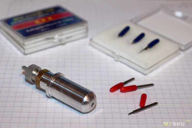 Всем доброго дня! Хочу поведать про держатель ножей для резки виниловой пленки (самоклеящаяся пленка от Оракал, например), а также про небольшую его доработку применительно к установке на самодельный фрезерный станок с ЧПУ. Обзор для любителей самоделок. Фото и видео присутствуют. Для начала скажу, что здесь уже есть обзор на подобный девайс, ссылка внизу. В моем варианте есть нюансы и ответы на некоторые вопросы, которые задавались в комментариях, про установку офсета, нажим… Начнем. Увидел на Али такой держатель (1 шт.), как я понял для режущих плоттеров Roland, и комплект ножей к нему (6 шт.). Ножи с углами лезвий 45 и 60 градусов, офсет (смещение кончика ножа относительно оси) – 0.25 мм. Забегая вперед скажу, что особой разницы при резке Оракала я не заметил, но выяснил, что 45 градусов – это универсальные ножи, подходящие для большинства видов пленок, а 60 градусов используются, как правило, для толстых пленок. Давно витала идея прикрутить к своему самодельному станку с ЧПУ подо