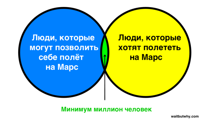 Маск думает, что желание (жёлтый кружок) будет увеличиваться, как только появится осуществимая возможность, Маск характеризует крошечный синий кружок как критический, огранивающий фактор: слишком высокую стоимость космических путешествий. Ключом для соединения между пунктами А и Б является изменение такого положения дел.