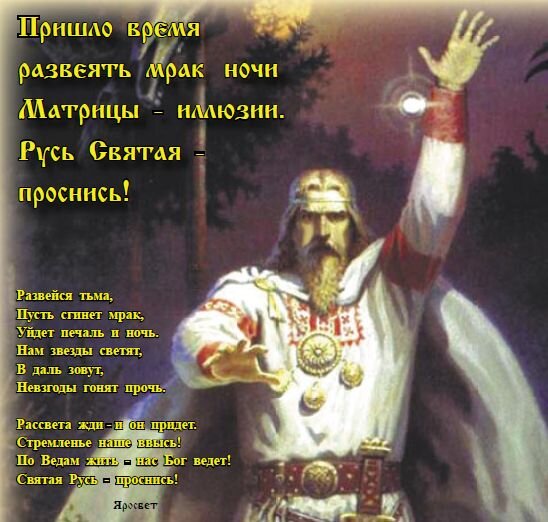 Не ждать нам надо времени, что принесут на блюдечке богатство и приют. Святая Русь Соборная, Святая Русь Богатая, Святая Русь Могучая, святая Русь!.. идёт! Навна поднимается, а Яросвет сражается во имя жизни в Вечности, Свободе и Любви!