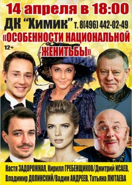 Спектакль «Особенности национальной женитьбы» по пьесе А.Н. Островского «Волки и овцы», комедия (2 часа 1 антракт). Любовь! На что готова женщина ради любви? Да на всё! Страсть, нежность, коварство, обман - все средства хороши, чтобы заполучить любимого. Обо всем этом (и кое о чем ещё) Вам расскажут с присущим им юмором Ваши любимые артисты. Изящные декорации, роскошные костюмы и блестящее актерское исполнение. Два часа несравненного удовольствия ждут Вас на нашем комедийном спектакле. В спектакле заняты: Анастасия Задорожная / Полина Долинская