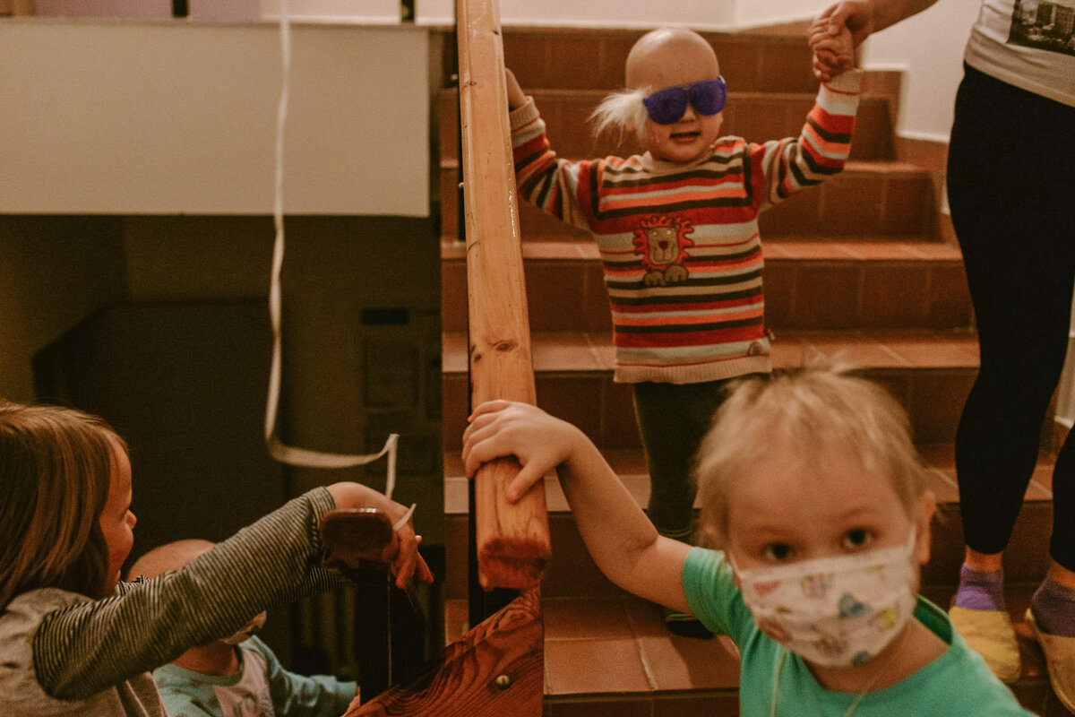 Дети в это время сидят на руках у мам или занимают себя в игровой комнате. Спрятаться там в бассейне с шариками — фирменное соревнование детей в масках. Фирменное занятие мам — убираться в доме с помощью специального дезинфицирующего средства. Бактериям здесь объявлена настоящая война.