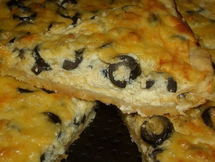 И снова я к вам с пирогом, ну очень вкусным, ароматным, сытным, пальчики оближешь) Только прочитав состав, уже можно сделать вывод о его вкусе. Готовить не скажу, что сложно, по времени не долго. Вообщем, обязательно попробуйте, прям настоятельно рекомендую!!! Понадобится: Для теста: 250 грамм муки 100 грамм сливочного масла 50 мл воды соль Для начинки: 150 грамм твёрдого сыра 100 мл молока 3 яйца 50 грамм слив. масла 150 грамм маслин без косточек 100 грамм творога соль Приготовление: Муку хорошо растереть с маслом, добавить воду и соль. Замесить однородное тесто. Раскатать его в пласт, выложить в смазанную форму для запекания. Вилкой по всей поверхности теста сделать проколы. Сыр натереть на крупной тёрке, половину выложить на тесто. Маслины порезать кружочками и выложить поверх сыра. Сливочное масло нарезать кусочками и положить следующим слоем. Яйца взбить с молоком и творогом, посолить, вылить смесь на начинку. Сверху посыпать оставшимся сыром. Запекать в духовке при t 180 град
